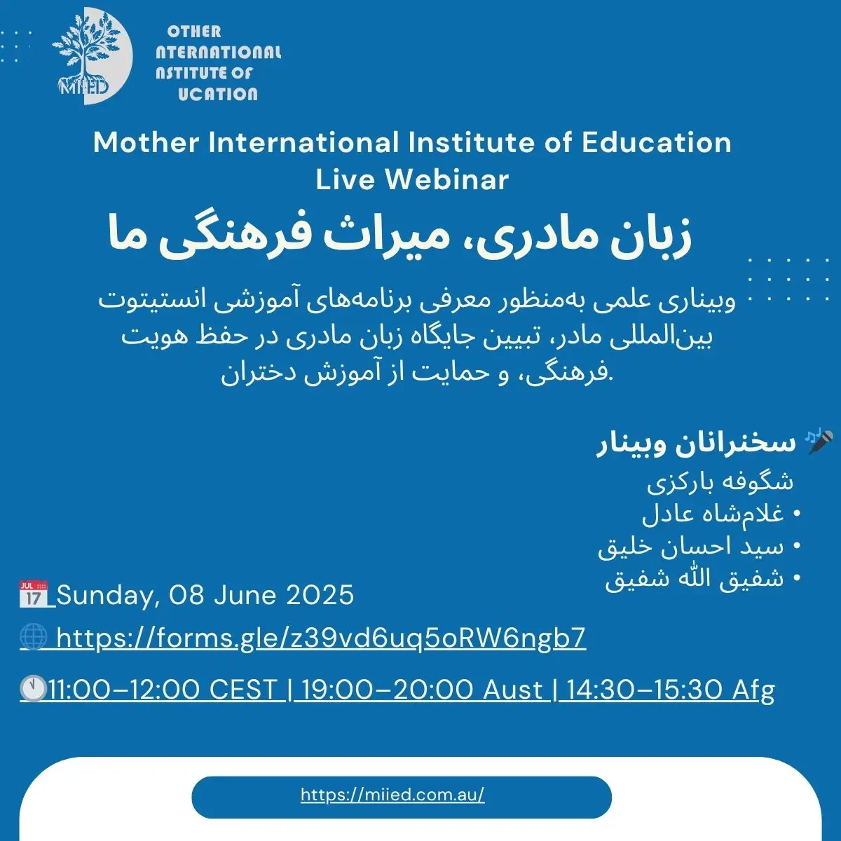 این وبینار با تمرکز بر اهمیت زبان مادری در حفظ هویت فرهنگی، تقویت پیوندهای نسلی، و حمایت از آموزش دختران در افغانستان، فرصتی برای تعامل، آگاهیبخشی و تشویق به مشارکت در برنامههای آموزشی انستیتوت فراهم میآورد.